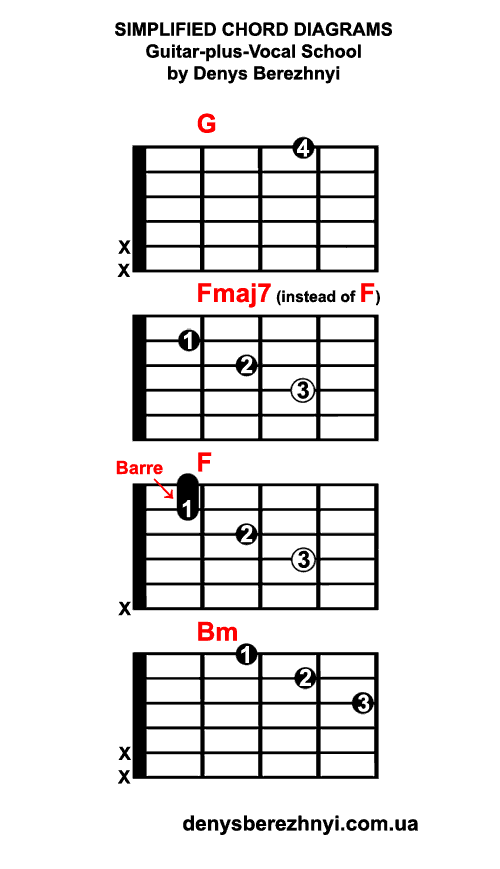 Denys BerezhnyiGuitar-plus-Vocal SchoolCorrect Chord DiagramsThese Guitar Chord Diagrams were created specially for learning to sing and play guitar at the same time. I needed them for webcam lessons. But I have not found really useful chord diagrams on the internet. They must include a system of root and alternate basses, proper fingering, exact positions of the fingers on the fingerboard, difference between "frets" and "fret wires", and so forth. So I made them.