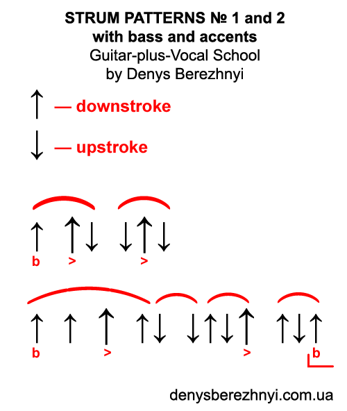 Visual aids for webcam lessons. Strum patterns No. 1 and 2 from Strumming Patterns Collection.